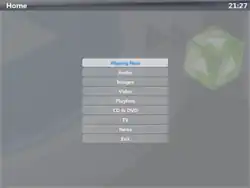 This is made to work on a large screen, such as a television, projector or large computer screen. The interface is made to work in a 10-foot mode, i.e. from a living room sofa using remote controls, rather than the conventional mouse and keyboard.