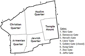 {{cite book}}:|work=ignored (help) - ↑ "Jerusalem's Jaffa Gate is reopened". Jewish Telegraphic Agency. 2010-04-21. Retrieved 2010-05-03.