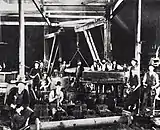 The James Martin & Co. works yard (1906, when production of agricultural machinery continued) Workers in the 1890s, holding up the tools of trade used in manufacturing locomotives and agricultural and mining equipment (1890s) Workers leaving the factory (1907)