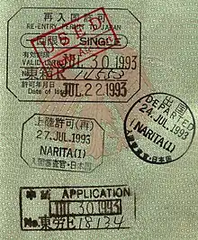 The Re-entry Permit can be issued to residents of Japan who are stateless or cannot get a passport from their country, such as de facto refugees holding resident status other than as a 1951 Convention Refugee, including those holding a residence status of student, designated activities, etc. under considerations of humanitarian. It is also used by people whose nationality is not recognized in Japan (e.g. North Korean nationals, or Koreans in Japan who retain Joseon nationality but acquired neither South Korea nor North Korea nationality).[2][3][4]