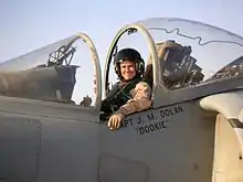 Dolan's first tour of duty took place from January to May during the 2003 invasion of Iraq.[3] She deployed with VMA-542 aboard the USS Bataan (LHD-5)—the only woman in her squadron. Dolan became the first woman to fly the AV-8B Harrier in combat[4][5] on the evening of March 19, 2003 in support of the shock and awe campaign that utilized overwhelming power and displays of force to quickly end the military effectiveness of Iraqi forces. She flew close air support missions destroying targets in designated kill boxes and protecting troops engaged with the enemy. Upon returning home, she was selected to attend the Weapons and Tactics Instructor (WTI) course at MCAS Yuma in Arizona. WTI is a prestigious seven-week course that trains marine aviators in advanced air-to-air and air-to-ground tactics in order to return them to their squadrons to train other pilots.[1][4]