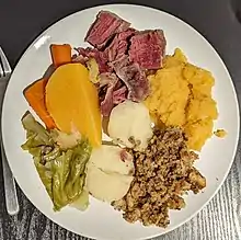 Jiggs dinner, also called boiled dinner or cooked dinner, is a traditional meal commonly prepared and eaten on Sundays in Newfoundland.[1] Corned beef and cabbage was the favorite meal of Jiggs, the central character in the popular, long-running comic strip Bringing Up Father by George McManus and Zeke Zekley.
