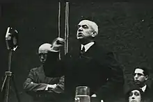 In the Cortes[153] initially Beunza adopted a moderate posture. During his inaugural address in late July he admitted that the Catalan issue appeared more urgent than the Basque one and did not press the cause of autonomous statute. He merely asked that the regular ayuntamientos – in early days of the Republic replaced by appointed comisiones gestoras, the move he considered somehow justified given threat of revolutionary violence – be restored now that the situation stabilized.[154] Beunza did not advance anti-Republican propaganda, though in August in name of Minoría Vasco-Navarra he voiced against exaltation of pro-republican Jaca rebels, executed during last days of the monarchy.[155] In September 1931 – once Estatuto de Estella has been finalised – together with the nationalist leader José Antonio Aguirre and during a solemn ceremony, accompanied by some 400 alcaldes from Basque-Navarrese municipios, he handed the autonomy statute proposal to the then prime minister, Niceto Alcala-Zamora.[156]
