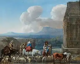 His landscapes often include battle or military scenes with many figures.[14] His landscapes are in an Italianate style. One of his paintings representing a Market in the Roman Campagna was formerly attributed to the Flemish Italianate painter Anton Goubau.[15] Other of his landscapes tend towards the genre scenes painted by the group of Flemish and Dutch painters in Rome known as the Bamboccianti.[16] The Bamboccianti comprised mostly Dutch and Flemish artists who had brought existing traditions of depicting peasant subjects from sixteenth-century Netherlandish art with them to Italy,[17] and generally created small cabinet paintings or etchings of the everyday life of the lower classes in Rome and its countryside.[18]