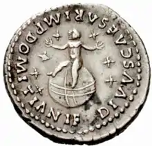 One aspect of the vision is the portrayal of Jesus holding seven stars in his right hand. Such a motif is also found on coins of the Emperor Domitian. Sometime between 77 and 81, Domitian's infant son died.[18] He was subsequently deified, and is portrayed on coins of Domitian, with seven stars. Ernest Janzen argues that the globe on which the infant stands represents world dominion and power, while the stars indicate his divine nature; he is depicted as "the son of (a) god" and "conqueror of the world."[19] Although Domitian's son cannot be said to be holding the stars, some scholars have drawn parallels between the numismatic and biblical evidences. Frederick Murphy notes that "Revelation's image of Jesus with seven stars in his hand may be an allusion to that coin and an implicit critique of it. It is not the Roman imperial family that has cosmic significance, but Jesus."[13]