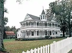 A unique example of Steamboat Gothic architecture, the John Blue House provides a glimpse into the past of the rural Carolinas. The home features 12 exterior doors, each with its own stained glass light above. The house has nine fireplaces and rare double circular porches.[2]