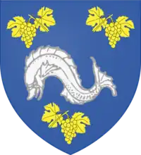 Azure a Dolphin naiant Argent between three Bunches of Grapes stalked and leaved Gold