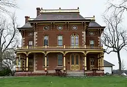 The John K. Voorhees House is a historic building located northwest of Oskaloosa, Iowa, United States. A native of Warren County, Ohio, Voorhees settled in Mahaska County in 1853. He owned 400 acres (160 ha), and was considered a leading farmer in the county.[2] He was known for his horses and Black Angus cattle. Voorhees had this house built in 1871, and he supervised the work that was done by masons and carpenters. It is a combination of the Italianate and Second Empire styles. The 2½-story, brick structure follows a T-plan. It features a mansard roof, bracketed eaves, limestone quoins on the front, brick quoins on the back, and a full sized wrap-around front porch. The east section of the original porch and the balustrades on top had been removed.[2] They have subsequently been recreated. The house was listed on the National Register of Historic Places in 1982.[1]