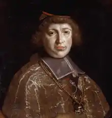 John was born in 1499, well before Sigismund's first marriage to Barbara Zápolya in 1512. In July 1510, John's father received papal dispensation to remove defectus natalium, recognize him as a legitimate son, and ennoble him.[1] John was granted the title "of the Lithuanian Dukes" around 1514[2] and used a version of the Lithuanian coat of arms.[3] John became canon in Kraków in 1510 and in Poznań in 1516.[1] John was a student at Kraków Academy and University of Bologna.[2] In 1519, at the age of 21, John was nominated Bishop of Vilnius by his father. Long-term canon of Vilnius John Filipowicz was nominated to become Bishop of Kiev.[4] Pope Leo X confirmed the nomination even though John was not yet ordained as priest (it happened only in 1531)[4] and the Third Council of the Lateran required bishops to be at least 30 years of age. John was accompanied by his mother, who interfered in diocesan affairs. John and his mother faced a lot of opposition in Vilnius; he was even physically attacked and injured by Stanisław, son of Grand Chancellor Mikołaj II Radziwiłł.[4] That prompted the pope to place John under the tutelage of Bishops of Kraków and Lutsk.[4]