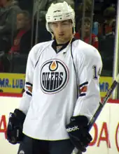 During the 2010 off-season, the Oilers signed Eberle's former national team teammate Taylor Hall to an NHL contract. They subsequently attended the Oilers' Development Camp together in the summer of 2010.[37] They were also one of 16 forwards named to the Oilers Young Stars roster for their tournament against the Vancouver Canucks, Anaheim Ducks, Calgary Flames, and San Jose Sharks[38] Eberle then attended his third Rookie Camp with the Oilers, where the team announced that Eberle would wear the #14 while playing for the Oilers.[39][notes 1] After impressing during rookie camp, Eberle was named to the Oilers opening night roster for the 2010–11 season.[40] He subsequently made his NHL debut with the Oilers on October 7, 2010, against the Calgary Flames. During the game, he recorded his first goal in the third period and later added an assist on the powerplay to lead the team to a 4–0 win.[41] The goal was later voted by fans as the NHL's Goal of the Year on the League's Facebook page,[42] as well as Play of the Year on The Sports Network's (TSN) website.[43] Early into his rookie season, Eberle was playing on a line with Shawn Horcoff and Taylor Hall[44] while on pace for 50 points.[45] By January 1, he had accumulated nine goals and 14 assists through 36 games before suffering a high ankle sprain during a game against the Flames.[46] While sidelined with the injury, he underwent an unrelated emergency appendectomy. He ended up missing a month before being able to return to the Oiler's lineup.[47] Upon returning from the surgery, Eberle recorded two-assists in their 5–3 loss to the St. Louis Blues.[48] Later, in April, Eberle received a hit to the head from opposing forward Raffi Torres. While Eberle was not injured on the play, Torres received a four-game suspension for the hit.[49] Though the Oilers finished with the worst record in the NHL for the second straight year, Eberle finished the season with 18 goals and 25 assists for 43 points through 69 games.[50]