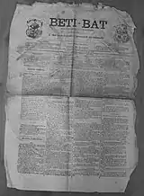 An ardent supporter of separate Biscay foral establishments, Ampuero was also an enthusiast of Basque culture; himself he spoke and wrote Basque with pleasure and frequently preferred to use euskara rather than castellano.[49] As part of his electoral campaign, though also as his private campaign to promote both Basque and foral rights, in 1881 and together with Gustavo Cobreros[50] he co-founded a Bilbao-based periodical, Beti-bat (eng. "never changing").[51] From the onset it suffered financial problems and has never gone beyond 500 subscribers;[52] highly flavored with traditionalist outlook, Beti-bat suffered also because of internal divisions within the movement[53] and ceased to exist in the mid-1880s. At the time Ampuero launched another Basque initiative; 1885 marked the inauguration of Fiestas Euskaras, a Durango-based annual multi-cultural event which followed the pattern of juegos florales.[54] Highly influenced by early vascologist initiatives of Antoine d'Abbadie and his own distant relative Vicente Araña,[55] Ampuero officially appeared as president of “Comisión de las Fiestas Euskaras”[56] and formatted the event as competition in categories such as literature, music and paintings, all related to Basque culture; in 1885 there were 28 different contributions presented.[57] Fiestas were re-staged in 1886[58] and irregularly also later on. Ampuero was reportedly nominated himself for a prize related to his Cartilla del agricultor vascongado,[59] which he reportedly declined out of modesty.[60]