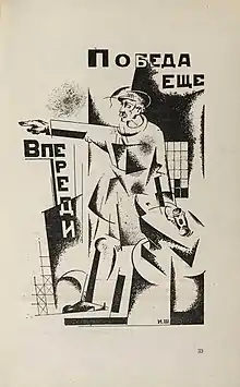 His illustrations for Youth, Go! convey an image of the body reduced to a number of basic geometric shapes – circles, triangles, rectangles; a body devoid of symmetry and naturalness, and instead resembling a mannequin with limbs suspended on spherical joints and body parts freely detachable one from another. ... In Youth, Go!, the anatomy of the human hand is followed by the anatomy of an axe, insofar as both are part of a single whole: the new socialist working class.[2]