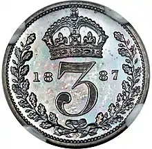 The silver threepence, as well as the Maundy coinage (which would not appear with the new obverse until 1888, as the Royal Maundy had already occurred before the new coins were ready) carried their longtime designs (since 1822) of a wreathed and crowned number indicating their denominations,[24][25] though changes were made to the crown, and the Maundy twopence carried a different style figure 2. Leonard Wyon made those alterations from the designs of Jean Baptiste Merlen, and they are still used as the Maundy reverse designs.[26][27] No change was made to either side of the bronze coinage (the penny and its fractions) as there was then a large surplus of bronze pieces.[19] Nevertheless, pattern coins of the penny, halfpenny and farthing were prepared with obverse designs similar to Boehm's.[28] The Jubilee coinage bore shortened forms of the wording VICTORIA DEI GRATIA BRITANNIARUM REGINA FIDEI DEFENSOR (Latin for "Victoria by the grace of God queen of the British territories, Defender of the Faith").[19][29] The abbreviated form of Britanniarum is rendered as BRITT rather than with a single T  Gladstone, a classical scholar as well as a politician, had pointed out that the abbreviation of a Latin plural noun should end with a doubled consonant.[12]