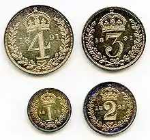 The Jubilee coinage or Jubilee head coinage are British coins with an obverse featuring a depiction of Queen Victoria by Joseph Edgar Boehm. The design was placed on the silver and gold circulating coinage beginning in 1887, and on the Maundy coinage beginning in 1888. The depiction of Victoria wearing a crown that was seen as too small was widely mocked, and was replaced in 1893. The series saw the entire issuance of the double florin (1887–1890) and, in 1888, the last issue for circulation of the groat, or fourpence piece, although it was intended for use in British Guiana. No bronze coins (the penny and its fractions) were struck with the Jubilee design.