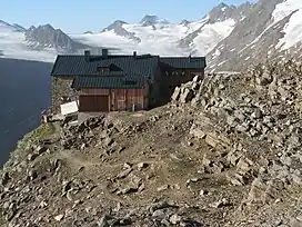 ![]() Ramolhaus in front of the Gurgler Ferner (glacier). Karlesspitze is the peak on the right. | |