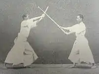 Kenjutsu was practiced in a thick kimono (keikogi) in the old times. It was needed for protection, though it was sometimes still not enough. Practices are far less dangerous nowadays, the standard clothes in kenjutsu are normal keikogi (稽古着) and hakama (袴). Preferably all pieces are in the same colour of dark blue or, when one seriously dedicates the practice to the kami (神), in white. To prevent treading on the hakama when moving in a low position, the hakama is raised a bit by neatly folding the left and right outside front pleats up under the straps which are tied around the waist, before training commences.[5] It is possible to wear tabi (足袋) when necessary.