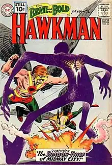 The Silver Age Hawkman (Katar Hol) was first introduced in The Brave and the Bold #34 by artist Joe Kubert and writer Gardner Fox. At this time DC had already rebooted many of its characters such as the Flash and Green Lantern. Hawkman's first appearance sold well and spawned five more tryout issues in The Brave and the Bold. During these issues, he teamed up with his wife, Hawkgirl, to battle foes on earth as well as on his home planet Thanagar.[2]