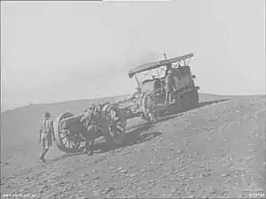 134th Siege Battery, RGA, was formed at Dover on 3 May 1916 with a nucleus of Territorials drawn from the Kent and Sussex RGA units.[44][47] The battery was equipped with four modern 6-inch 26 cwt howitzers and was sent to the Macedonian front, arriving at Salonika on 20 August 1916. It served with XII Corps in the Vardar and Struma valleys.[46][48] In 1917 it fought in the Second Battle of Doiran, but was then moved to the Palestine Front, where it fought with XXI Corps in the Third Battle of Gaza, the capture of Jerusalem and the victorious Battle of Megiddo.[46][49][50] 134th Siege Battery was disbanded in 1919.[44]