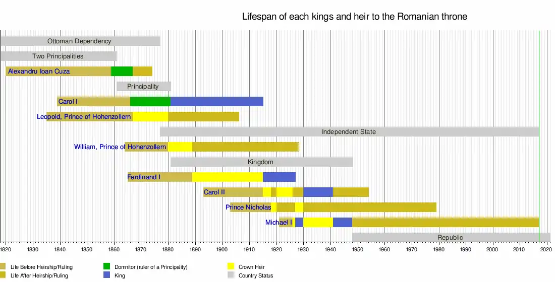 Michael I of RomaniaPrince Nicholas of RomaniaCarol II of RomaniaFerdinand I of RomaniaWilliam, Prince of HohenzollernLeopold, Prince of HohenzollernCarol I of RomaniaAlexandru Ioan Cuza
