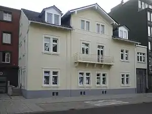 The Kirchnerhaus was built in 1862 at almost the same time as the opposite station building in the classical style. At the back of the house there was a large garden. A brick wall facing Bahnhofsstraße protected residents from the noise and smoke of passing trains. The house has a central projection and two dormer windows. On the first floor, where the Kirchners lived in a 160 square meter apartment, there is a balcony with iron brackets and railings. The attic has the form of a dominant transverse gable in the central avant-corps. The house survived almost undamaged in both world wars and is therefore in its original condition. Around 1950, a three-storey outbuilding was added, the extension was used as a car repair shop and gas station. On the occasion of Kirchner's 75th birthday on 6 May 1955, the Aschaffenburg History and Art Association had a commemorative plaque designed by the sculptor Otto Gentil attached to the facade of the house.[1] The building, which is privately owned, was used for restaurants and then as an arcade until 1975. It was only set for sale in 2010. The city of Aschaffenburg did not use its right of first refusal. The new owner was very interested in the history of the house. In 2012 he had it renovated in line with the requirements of a monument. In the course of this renovation and after the arcade was moved into the neighboring building, the large shop windows on the front were removed.[2][3]
