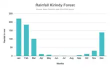 The Krindy Forest's climate is highly seasonal and tropical.[7] The cold and dry season generally takes place from March - April to November - December of each year. A season during which most trees shed their leaves.[8] The wet and hot season, also referred to as the rainy season[9] typically takes place from November - December to March - April. Some precipitations can be observed during this season which make the forest that makes access more difficult' hard to access[10] The annual rainfall is concentrated throughout the brief rainy season with an average of approximately 800mm of rainfall every year in the region. Temperatures range yearly between 19 °C and 40 °C((104 °F)) with an annual mean of 25 °C.[7]