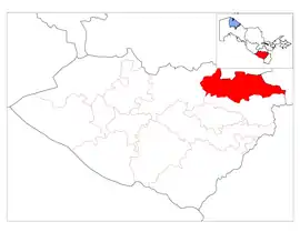 Kitob District (Uzbek: Kitob tumani) is a district of Qashqadaryo Region in Uzbekistan. The capital lies at the city Kitob.[1] It has an area of 1,750 km2 (680 sq mi)[2] and its population is 266,400 (2021 est.).[3] The district consists of one city (Kitob), 13 urban-type settlements (Alaqoʻyliq, Bektemir, Rus qishloq, Baxtdarvozasi, Beshterak, Varganza, Obikanda, Panji, Sariosiyo, Sevaz, Xoji, Yakkatut, Yangiobod) and 12 rural communities.[1]