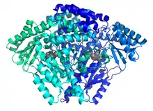 The enzyme histidine decarboxylase (EC 4.1.1.22, HDC) is transcribed on chromosome 15, region q21.1-21.2, and catalyzes the decarboxylation of histidine to form histamine. In mammals, histamine is an important biogenic amine with regulatory roles in neurotransmission, gastric acid secretion and immune response.[1][2] Histidine decarboxylase is the sole member of the histamine synthesis pathway, producing histamine in a one-step reaction. Histamine cannot be generated by any other known enzyme. HDC is therefore the primary source of histamine in most mammals and eukaryotes. The enzyme employs a pyridoxal 5'-phosphate (PLP) cofactor, in similarity to many amino acid decarboxylases.[3][4] Eukaryotes, as well as gram-negative bacteria share a common HDC, while gram-positive bacteria employ an evolutionarily unrelated pyruvoyl-dependent HDC.[5] In humans, histidine decarboxylase is encoded by the HDC gene.[2][6]