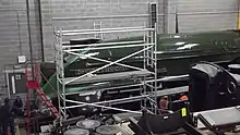 The final event in which 60008 was reunited with its five remaining A4 sisters was the 'Great Goodbye', held between 15 and 23 February 2014, at The National Railway Museum's Locomotion annex at Shildon. During this time, the National Railroad Museum was offered US$1 million by an undisclosed buyer for the engine to remain in the UK. The museum declined the offer and the engine remained on display at Shildon until mid-April 2014.[3] The engine, along with 60010 (which had been restored to its original number, 4489, as part of the exhibition plans) were covered in two layers of tarpaulins to protect and conceal them. In late April-early May, the covered engines were sent to the Port of Liverpool where they were loaded aboard the Atlantic Container Line's Atlantic Concert vessel for the voyage to Halifax. The engines were unloaded at the ports in Halifax on 11 May, where they were transferred on to flat cars to be taken by rail to their respective museums.[4] 60008 arrived at the National Railroad Museum in the Green Bay suburb of Ashwaubenon on 6 June 2014 and, on 23 June, the museum had returned the engine to the display building in which it was displayed prior to leaving for the UK.[5] The museum officially unveiled the engine as part of a new World War II themed exhibit on 2 August 2014.