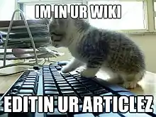 Common themes include jokes of the form "Im in ur [noun], [verb]-ing ur [related noun]."[27] Many lolcat images capture cats performing characteristically human actions or appearing to use modern technology, such as computers.