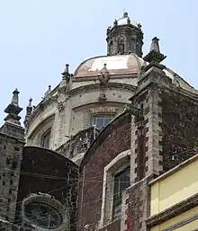 The church building consists of three naves with the center one being significantly wider than the side ones.[1] Its architectural style is similar to the Tabernacle of the Mexico City Cathedral. Because of this, many consider this church to be the work of the same architect, Lorenzo Rodriguez. However, this is in dispute because some elements that are common in Rodriguez's other works are lacking here,[1] and some records indicate that architect Ildefonso Iniesta Bejarano was involved in the project.[2] The dome outside is decorated with tiles forming Maltese crosses, a symbol of the Trinitarians.[2] The basic floor plan is that of a Latin cross, common to churches in the 17th and 18th centuries. It has a vaulted roof of eight sides which reaches to a central point, containing windows for lighting. The church is of the profusely-decorated Baroque style, but some areas, like the roof are relatively unadorned.[2]