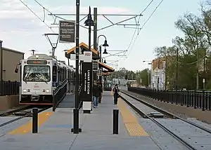 Lamar is an at-grade light rail station on the W Line of the RTD Rail system. It is located near the intersection of West 13th Avenue and Lamar Street, after which the station is named, in Lakewood, Colorado.[1] The station is located within Lakewood's 40 West Arts District, not far from the businesses on West Colfax Avenue and about 0.7 miles (1.1 km) from the campus of the Rocky Mountain College of Art and Design.