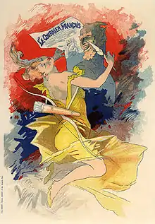 Under the direction of Jules Roques, Le Courrier français became the most representative satirical organ of the time.[2] Notable writers included Maurice Bouchor, Raoul Ponchon, Georges Montorgueil, Hugues Delorme and Jean Lorrain. Illustrators included Adolphe Willette, David Ossipovitch Widhopff, Jean-Louis Forain, Jules Chéret, Hermann-Paul, Henri Pille and Pierre Jeannot.[2] The magazine included sections on literature, fine arts, theater, medicine and finance.