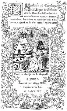 Little John of Saintré (French: Le Petit Jehan de Saintré), full title L'Hystoire et plaisante cronicque du petit Jehan de Saintré et de la jeune dame des Belles-Cousines sans aultre nom nommer, is a 1456 novel or romance written by Antoine de la Salle. It was the author's most successful work, written when he was nearly 70 years of age.[1] He dedicated to it his former pupil, Jean de Calibre. An envoi in manuscript 10,057 (nouv. acq. fr.) in the Bibliothèque Nationale, Paris, states that it was completed at Grand Châtelet on 6 March 1455 (i.e. 1456).[1]