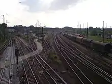 The Riesa–Zeithain section, including the three-track Elbe crossing,[29] and the new selection of line connecting to the Berlin–Dresden railway were completed as part of the third stage of construction. The 13 km long upgrade of the line between Dresden-Neustadt and Coswig began in the autumn of 2009 and is expected to be completed in 2016. As a result of the upgrade, two separate tracks will be established for both the long-distance traffic and the Dresden S-Bahn. The signalling and the S-Bahn stations along the line are being completely renewed and a new Dresden Bischofsplatz station is being built as part of this work. Once the work is completed, the speed limit on this section will increase for long-distance and regional traffic from 120 km/h to 160 km/h.[30] Work has not begun on sections of this line at Riesa station and on the Röderau–Zeithain junction and Zeithain junction–Weißig sections.[23]