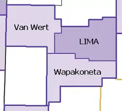 The Lima–Van Wert–Wapakoneta Combined Statistical Area (CSA) is made up of three counties in Northwest Ohio. The Lima Metropolitan Statistical Area and two Micropolitan Statistical Areas – Van Wert and Wapakoneta, are components of the CSA. As of the 2000 Census, the CSA had a population of 184,743 (though a July 1, 2009 estimate placed the population at 179,552).[1]