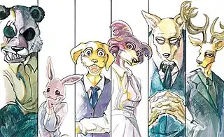 Itagaki had first conceptualized a wolf character while she attended junior high school; the design ideas remained similar, but over time she had different ideas for the character's story. Itagaki stated that she chose to make a wolf character as their similarity to dogs make them familiar to readers and that wolves' "sneaking around" makes them "cute".[3] The name "Legoshi" refers to actor Bela Lugosi while she used Mathieu Amalric as a model for Legoshi's face. She stated "I sometimes think of Kenichi Matsuyama when I'm drawing the body."[3]