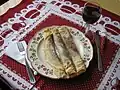 Literally "bread with a fur jacket", a savoury French toast or Gypsy toast or bread fritter, a breakfast food or sometimes as a side dish. | |