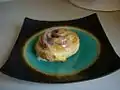 Cinnamon roll topped with melted chocolate |