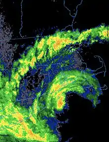 Most commonly, New England will see the remnants or weakening stage of most tropical cyclones that make landfall either along the United States east coast or Gulf coast. This can sometimes lead to excessive rainfall, and in rare cases destructive flooding. Hurricane Diane in 1955 produced over 19 inches of rain in Massachusetts and contributed to the 1955 Connecticut floods, one of the worst flooding events in Connecticut's history.[2] More recently, in 2011, a weakening Hurricane Irene produced historic flooding in Vermont, causing over $175 million in damage.[3]
