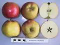 Arthur W. Barnes[6] Chester, England Raised 1902, introduced 1928 Parentage Gascoyne's Scarlet x Cox Orange. A yellow apple with red flush. Width 82 mm (3.2 in), height 70 mm (2.8 in). Stalk medium. Flesh is white, firm, fine textured, very juicy, acid. Cooking PickE mid- to late September; use November–March