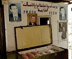 As a sign of his consolidation of power as Iraq's dictator, Saddam Hussein's personality cult pervaded Iraqi society. He had thousands of portraits, posters, statues and murals erected in his honor all over Iraq.[78] His face could be seen on the sides of office buildings, schools and classrooms, airports, and shops, as well as on all denominations of Iraqi currency (the dinar). Saddam's personality cult reflected his efforts to appeal to the various elements in Iraqi society. This was seen in his variety of apparel: he appeared in the costumes of the Bedouin, the traditional clothes of the Iraqi peasant (which he essentially wore during his childhood), and even appeared in Kurdish clothing, but he also appeared in Western suits fitted by his favorite tailor, projecting the image of an urbane and modern leader. Sometimes he would also be portrayed as a devout Muslim, wearing a full headdress and robe, praying towards Mecca, but most often he was depicted wearing a military uniform.[79]