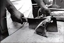 | Cleaver | Hacking through bone or slicing large vegetables (such as squash). The knife's broad side can also be used for crushing in food preparation (such as garlic). | A large broad bladed knife. | ![]() | |