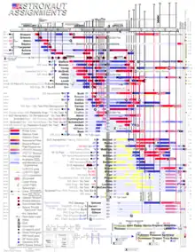 A chart showing U.S. astronaut assignments during the 1970s as graduated from the Mercury and Gemini programs.