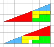 The missing square puzzle is an optical illusion used in mathematics classes to help students reason about geometrical figures.