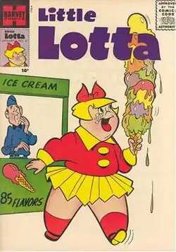 Little Lotta is a fictional character published by Harvey Comics from 1953 to 1972, and then sporadically until 1993. A contemporary of Little Audrey, Little Dot and Wendy the Good Little Witch, she was one of Harvey's best-known female characters during the 1960s and featured in many of the company's child-friendly comedy titles. Like many of Harvey's comic headliners, Lotta was notable for a quirky defining characteristic - in this case, an insatiable appetite giving rise to superhuman strength.[1]