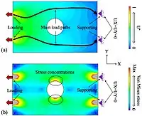 In the image to the right, a structural member with a central hole is placed under load bearing stress. Figure (a) shows the U* distribution and the resultant load paths while figure (b) is the von Mises Stress distribution. As can be seen from figure (b), higher stresses can be observed at the vicinity of the hole. However, it is unreasonable to conclude the main load passes that area with stress concentration because the hole (which has no material) is not important for carrying the load. The stress concentration caused by the structural singularities like a hole or a notch makes the load transfer analysis more difficult.