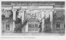 The first palace to open was Rector's, which opened its doors in 1899 on Broadway between 43rd and 44th streets.[8] Others quickly followed, including Bustanoby's, Churchill’s, Faust's, Martin's, Murray's Roman Gardens, Reisenweber's, and Shanley'0s. To one extent or another, each new establishment tried to top the others, whether in lavish decorations, themed interiors, entertainment, or in the purveying of unusual, exotic foreign fare often at exorbitant prices.[9]