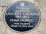 Acting on behalf of members of the White Conduit Club and backed against any losses by George Finch, 9th Earl of Winchilsea and Colonel Charles Lennox, Thomas Lord opened his first ground in May 1787 on the site where Dorset Square now stands, on land leased from the Portman Estate.[4] The White Conduit moved there from Islington, unhappy at the standard of the ground at White Conduit Fields, soon afterwards and reconstituted themselves as Marylebone Cricket Club (MCC). It was thought that the establishment of a new ground would offer more exclusivity to its members, with White Conduit Fields considered too far away from fashionable Oxford Street and the West End.[5] The first match played at the new ground saw Middlesex play Essex.[6][7] In 1811, feeling obliged to relocate because of a rise in rent, Lord removed his turf and relaid it at his second ground. This was short-lived because it lay on the route decided by Parliament for the Regent's Canal, in addition to the ground being unpopular with patrons.[7][6]