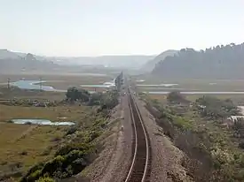 Originally, the railroad tracks travelled straight from Sorrento Valley on the eastern side of the Lagoon and ran parallel north of what is now Carmel Valley Road, therefore the impact on the tidal circulation and the mouth was much smaller than for the other lagoons nearby.[12] However, in 1925, the Santa Fe Railroad built a single-track roadbed causeway embankment down the center of the lagoon for its Surf Line, which still is in use today on a daily basis by the Coaster and Pacific Surfliner as well as BNSF Railway freight trains. This embankment severely restricted the normal historical lagoon drainage for the first time, and changed the tidal flow and current pattern.[1] The four original wooden trestle bridges crossing the lagoon (three over the water[8] and one over the McGonigle Road) were replaced between 2015 and 2017 with new concrete bridges to help modernize the railroad traffic to and from San Diego. Even though the bridges were replaced, this area was not double-tracked because it is possible that these tracks will eventually be bypassed by a two-track tunnel underneath Del Mar.[19]