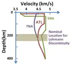 The LVZ shows a reduction in velocity of about 3–6% with the effect being more pronounced with S-waves compared to P-waves.[9] As is evident from the figure, the reduction and depth over which reduction occurs varies with the choice of tectonic province, that is, regions differ in their seismic characteristics. Following the drop, the base of the zone is marked by an increase in velocity, but it has not been possible to decide whether this transition is sharp or gradual. This lower boundary, found beneath the continental lithosphere and oceanic lithosphere away from mid-ocean ridges, is sometimes referred to as the Lehmann discontinuity and occurs at about 220±30 km depth. The interval also shows a reduction in Q, the seismic quality factor (representing a relatively high degree of seismic attenuation), and a relatively high electrical conductivity.